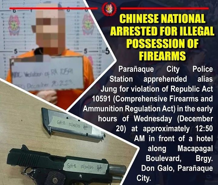 就在昨天凌晨(12月20号凌晨1点左右),1位华人就因为携带枪械时拿出来显摆,被菲律宾人看到后直接举报,以往慢吞吞的警方这次高效出动,而这位华人也毫无意外的被警方逮捕。